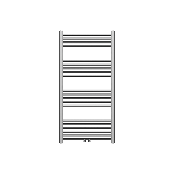 Dieser Handtuchheizkörper ist 120 cm hoch, 60 cm breit und 5 cm tief und bietet eine Heizleistung von 414 Watt. Mit seiner modernen gunmetal-grauen Oberfläche verleiht er jeder Badezimmereinrichtung einen Hauch von Raffinesse. Der Heizkörper verfügt über sechs Anschlüsse, darunter einen Mittelanschluss unten, was ihn äußerst flexibel in der Installation macht und ihn in verschiedene Badezimmerlayouts integrierbar macht.